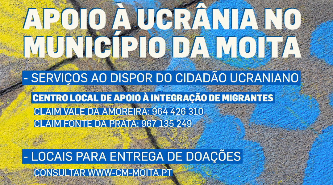 Não alheio aos acontecimentos que têm vindo a assolar o povo Ucraniano, o Município da Moita alia-se ao apoio a todos os cidadãos Ucranianos que necessitem de auxílio, através do Centro Local de Apoio à Integração de Migrantes - CLAIM, dos canais de ação social do Município e através da partilha dos locais e plataformas que estão neste momento a proceder à recolha de bens materiais, alimentos e medicamentos.