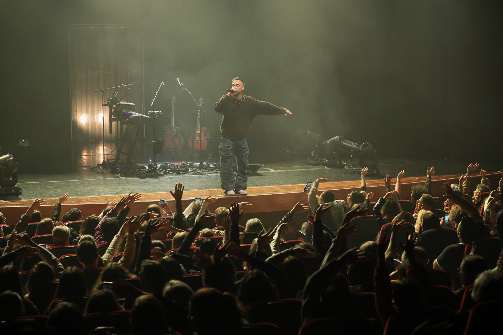 Apesar da noite fria e de Diogo se encontrar um pouco adoentado, nada disso foi problema para as cerca de 300 pessoas que encheram a sala de espetáculos da Baixa da Banheira.