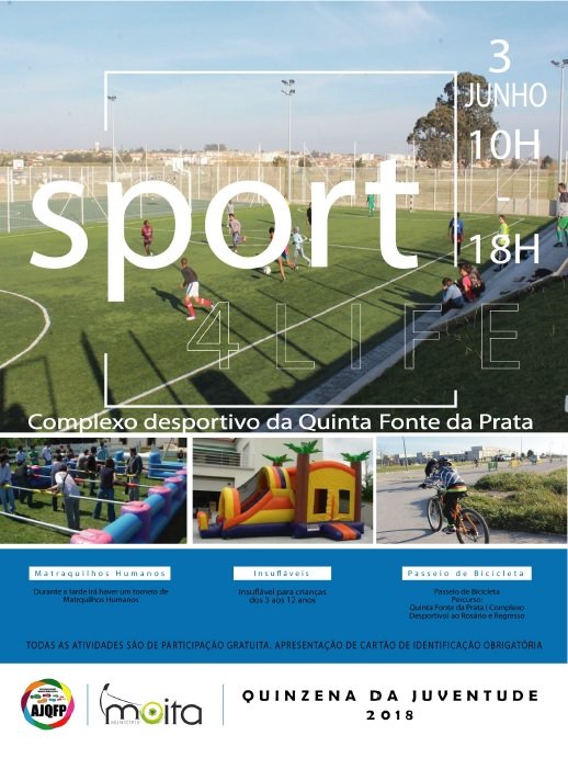 A iniciativa Sport 4 Life vai realizar-se no dia 3 de junho, entre as 10:00h e as 18:00h, no Complexo Desportivo da Fonte da Prata, em Alhos Vedros, promovida pela Associação Juvenil da Quinta da Fonte da Prata, com o apoio da Câmara Municipal da Moita.