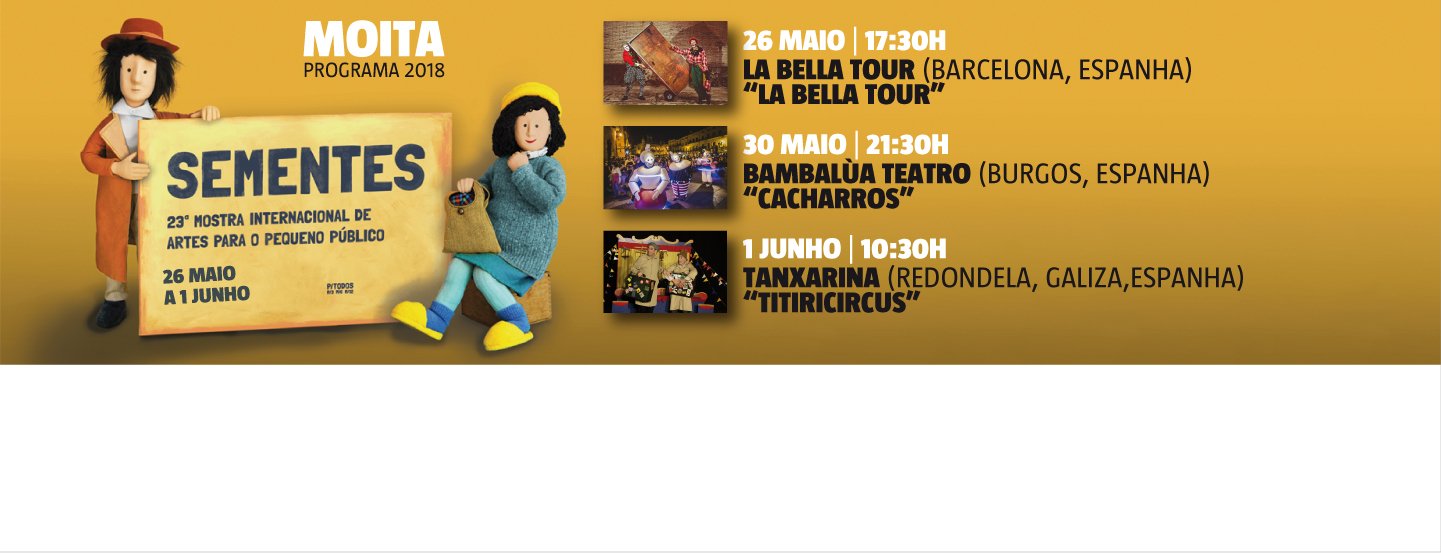 2019/05/16O concelho da Moita recebe, nos dias 18, 25 e 30 de maio, a 24ª edição de “Sementes” - Mostra Internacional de Artes para o Pequeno Público. Os espetáculos decorrem ao ar livre e têm entrada gratuita. Programa 18 de maio21:30hPraça Almada ... -