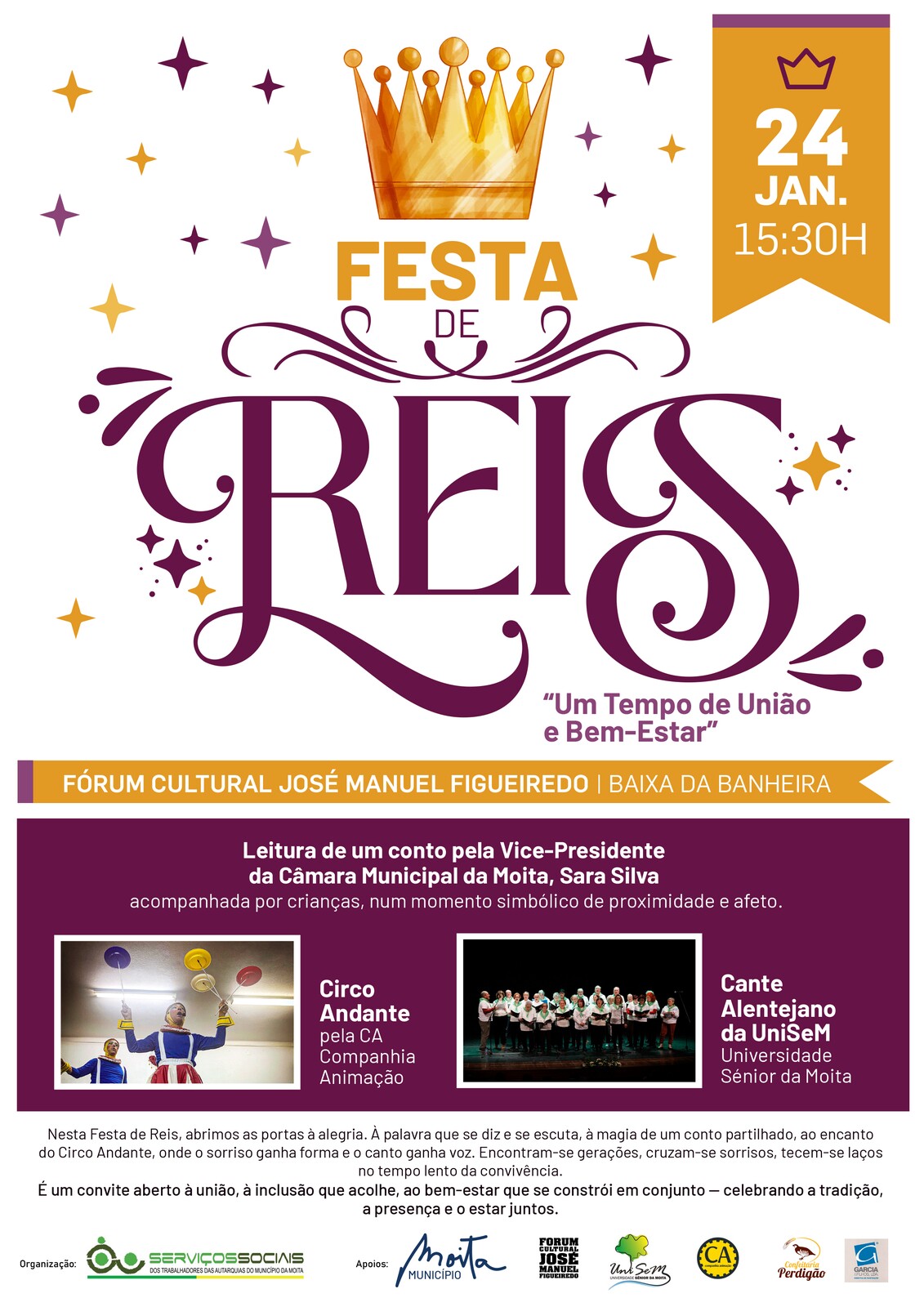 O evento termina com o tradicional Cantar das Janeiras, interpretado pela turma de Cante Alentejano da UniSem – Universidade Sénior, celebrando a cultura e as raízes alentejanas.